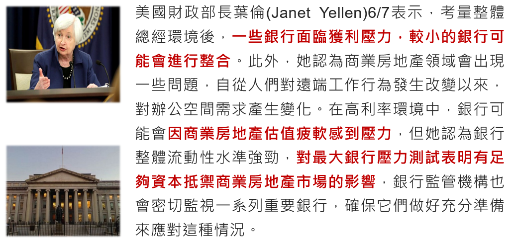 美國財政部長葉倫6/7表示,商業房地產估值疲弱會加重銀行營運壓力,未來較小銀行可能遭到整併