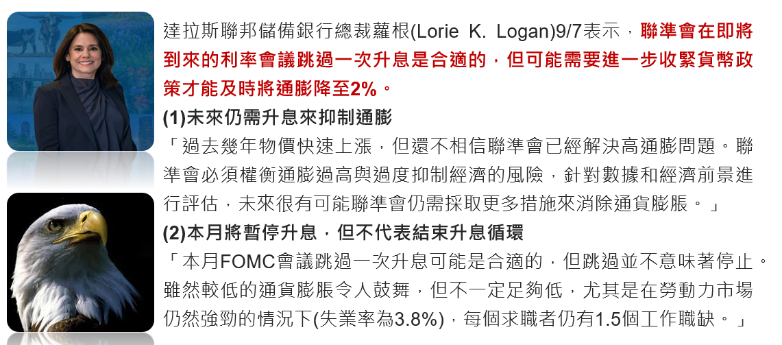達拉斯銀行總裁蘿根9/7表示,本月FOMC利率會議暫停升息是合適的,但不代表結束升息循環