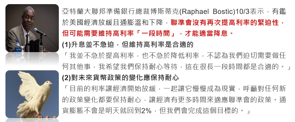 亞特蘭大銀行總裁博斯蒂克10/3表示,聯準會沒有提高利率的緊迫性,但需要維持高利率「一段時間」