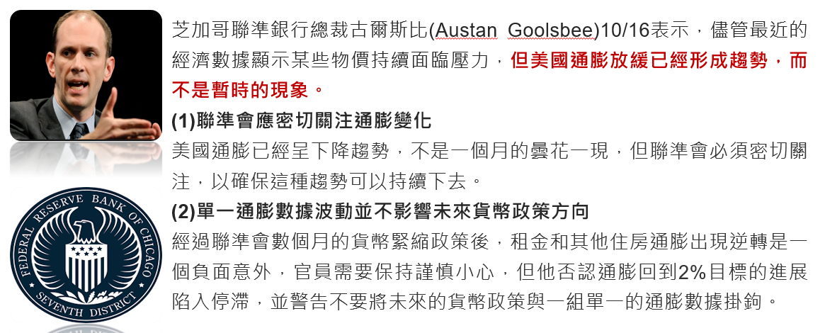 芝加哥銀行總裁古爾斯比10/16表示,美國通膨放緩已形成趨勢,不是短期現象