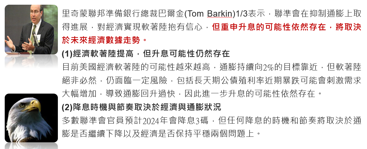 里奇蒙銀行總裁巴爾金1/3表示,對美國經濟實現軟著陸有信心,但重申升息可能性依然存在