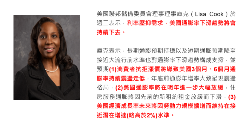 FED理事庫克於6/25表示,利率壓抑需求,美國通膨率下滑趨勢將會持續下去