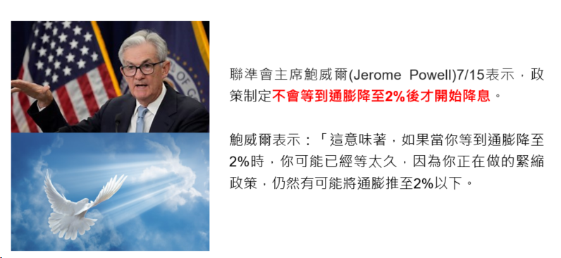 聯準會主席鮑威爾7/15表示,不會等到通膨降至2%後才開始降息
