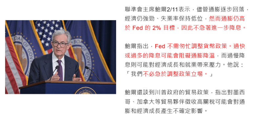 FED主席鮑爾2/11表示,不急於降息,隨時關注市場動態