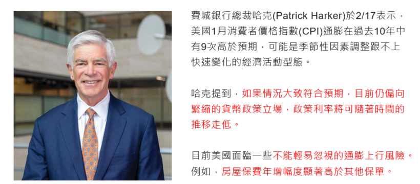 費城銀行總裁哈克於2/17表示,仍嚴陣以待,看待通膨上行風險