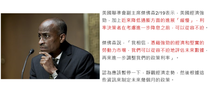 FED副主席傑佛森於2/19表示,暫緩降息,靜觀經濟走勢