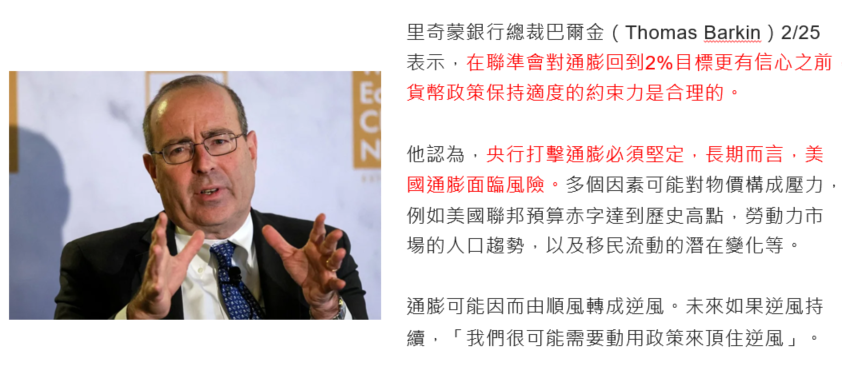 里奇蒙銀行總裁巴爾金2/25表示,FED打擊通膨必須堅定,長期通膨面臨風險