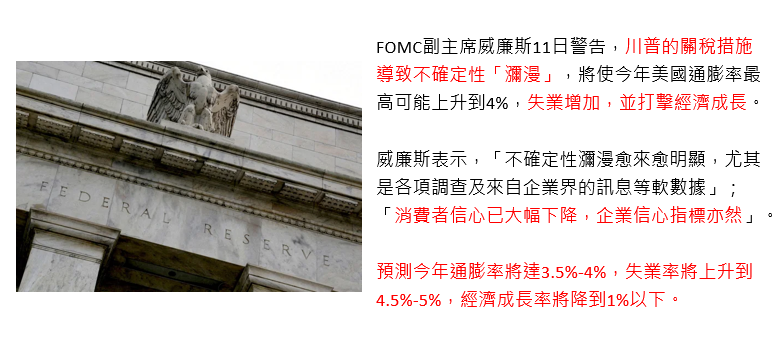 FOMC副主席威廉斯11日警告,關稅使不確定性提高,消費者信心已大幅下降