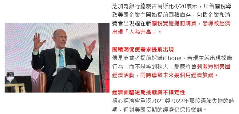 芝加哥銀行總裁古爾斯比4/20表示,關稅使經濟風險上升,恐導致經濟出現「人為升高」
