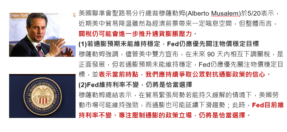 FED聖路易分行總裁穆薩勒姆5/20表示,目前維持利率不變的政策立場,仍將是恰當選擇