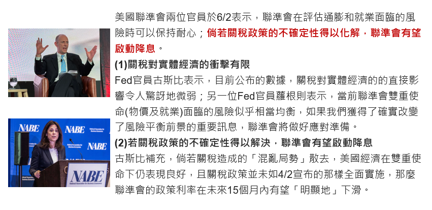 Fed官員於6/2表示,關稅政策不確定性消除後,Fed有望降息,目前可耐心觀望