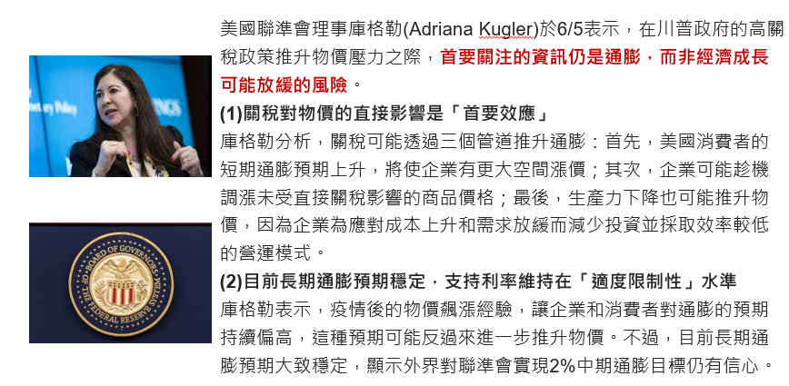 Fed理事庫格勒於6/5表示,支持政策利率維持在「適度限制性」水準