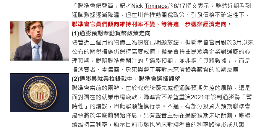 「聯準會傳聲筒」Nick Timiraos於6/17指出,在關稅政策引發價格不確定性下,聯準會傾向維持利率不變