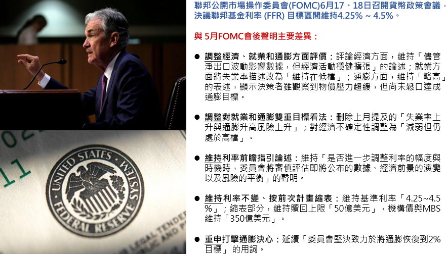 FOMC於6/17-18召開貨幣政策會議,決議利率區間維持4.25%-4.5%