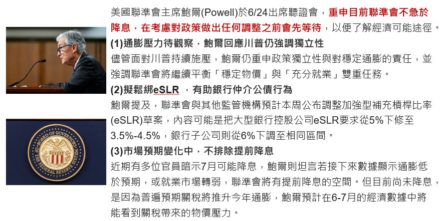 Fed主席鮑爾於6/24重申不急著降息,持續觀察關稅最終稅率的影響