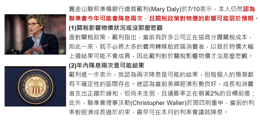 Fed官員戴利於7/10表示,預期今年將降息兩次