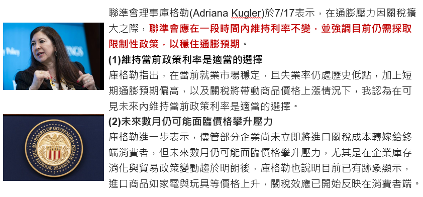 Fed理事庫格勒於7/17表示,關稅影響開始傳導,不降息是適當選擇