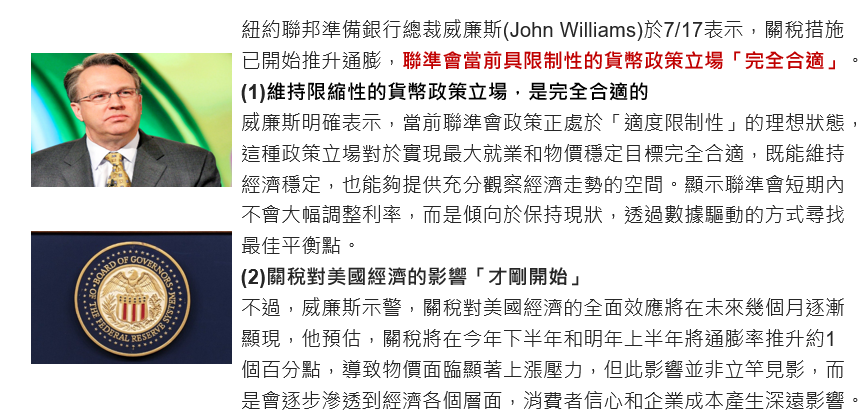 Fed官員威廉斯於7/17表示,關稅開始推升通膨,偏緊的貨幣政策完全合適