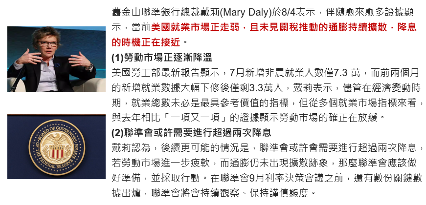 Fed官員於8/4表示,降息時機接近,今年有機會降息2次以上
