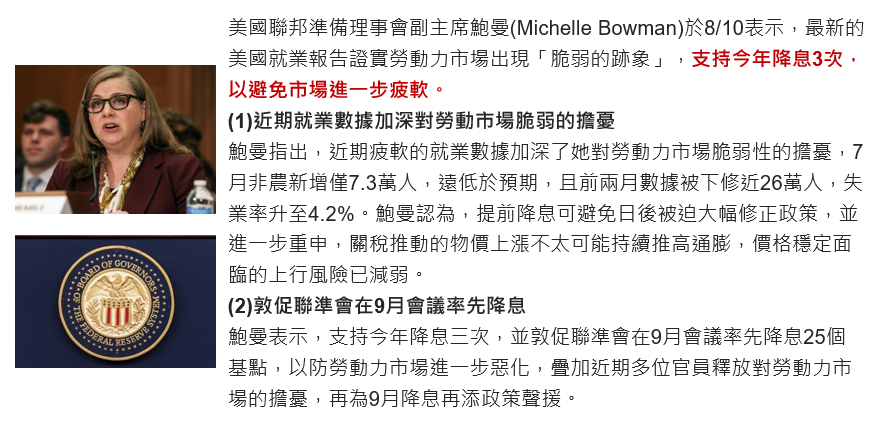 Fed官員於8/10表示,支持今年降息3次,以避免勞動市場進一步惡化