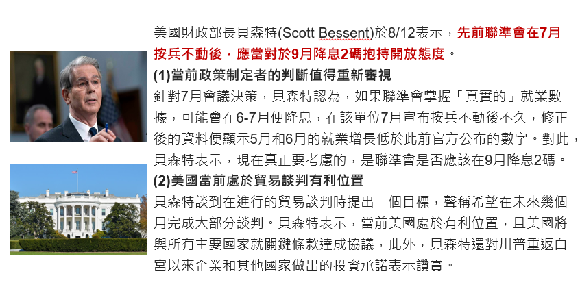 美國財政部長於8/12表示,聯準會應當對於9月降息2碼抱持開放態度