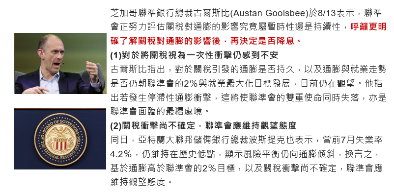 Fed官員古爾斯比於8/13表示,聯準會應更明確了解關稅對通膨的影響,再決定是否降息
