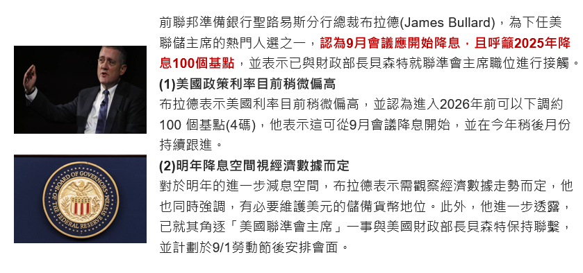 下任Fed主席人選布拉德於8/21表示,9月應開始降息