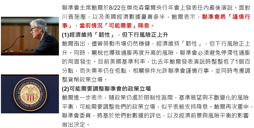 Fed主席鮑爾於8/22表示,聯準會將謹慎行事,「可能」需要降息