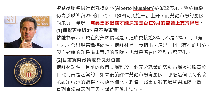 Fed官員穆薩林於8/22表示,需更多數據才能判斷9月是否降息