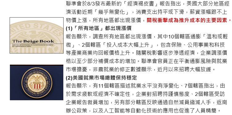 Fed於9/3公布經濟褐皮書表示,關稅正滲透各產業推升物價