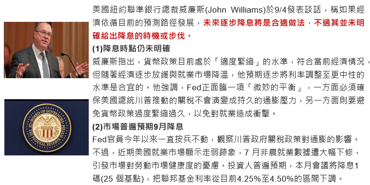 Fed官員威廉斯於9/4表示,隨時間推進,降息將成為適當之舉