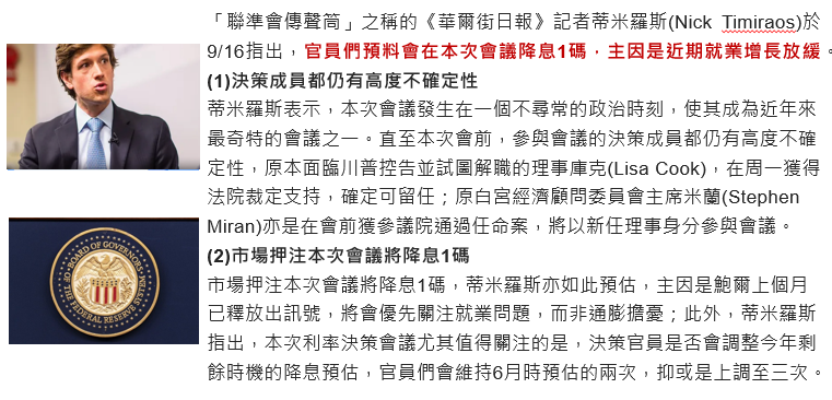 Fed傳聲筒蒂米羅斯於9/16表示,本周降息基本已成定局