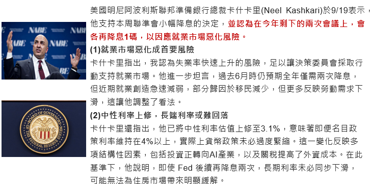 Fed官員卡什卡里於9/19表示,支持降息至年底,因應就業市場惡化風險