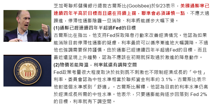 Fed官員古爾斯比於9/23表示,通膨率已連續四年半高於目標,聯準會必須謹慎