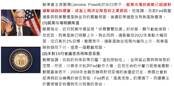 Fed主席鮑爾於9/23表示,目前面臨通膨與就業雙邊風險並存的艱難局面