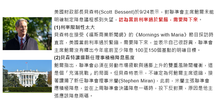 財政長貝森特於9/24表示,當前利率過於緊縮,需要降下來