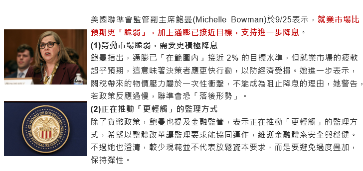 Fed監管副主席鮑曼於9/25表示,就業市場弱於預期,且通膨已接近目標,支持進一步降息