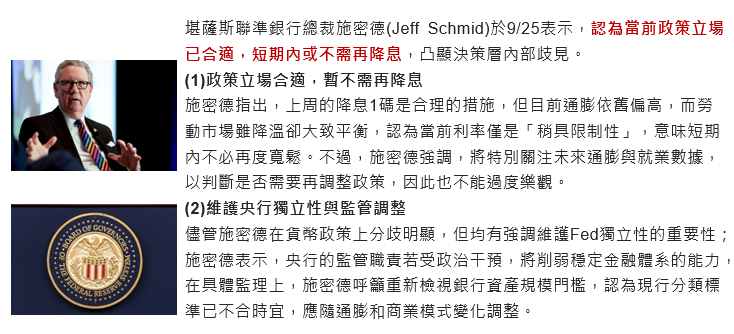 Fed官員施密德於9/25表示,當前政策立場已合適,短期內或不需再降息