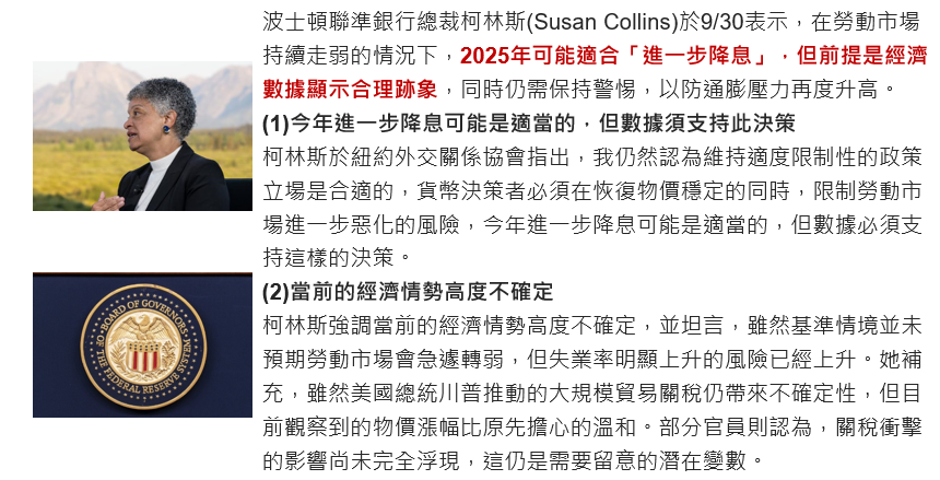 Fed官員柯林斯於9/30表示,2025年可能適合「進一步降息」,但前提是經濟數據顯示合理跡象
