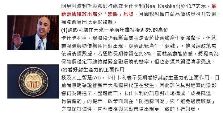 Fed官員卡什卡利於10/7表示,關稅對進口商品價格具推升效果,通膨前景更為複雜