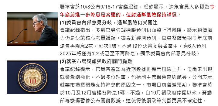 Fed於10/8公布會議紀錄,決策官員大多認為今年底前進一步降息是合適的