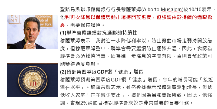 Fed官員穆薩萊姆於10/10表示,對再次降息持開放態度,但強調應繼續防止通膨升溫