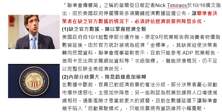 「Fed傳聲筒」Nick Timiraos於10/16表示,數據延遲公布,Fed必須評估降息步伐