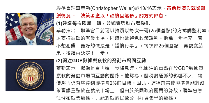 Fed理事華勒於10/16表示,Fed應以「謹慎且逐步」的方式降息