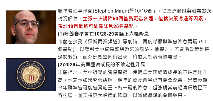 Fed理事米蘭於10/16表示,支持更大幅度的降息,對應美中貿易加劇的負面衝擊