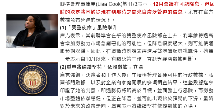 Fed理事庫克於11/3表示,12月會議有可能降息,但仍要基於可得資料決定