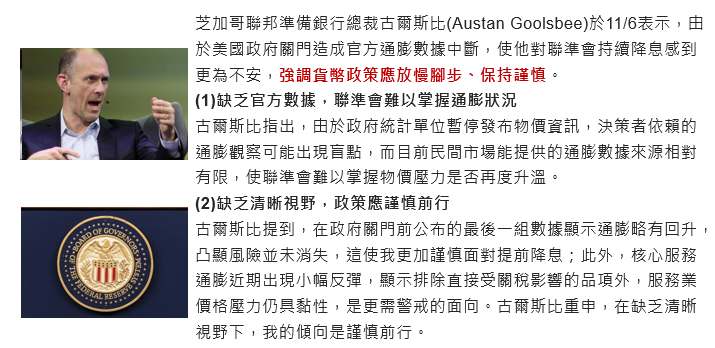 Fed官員古爾斯比於11/6表示,貨幣政策應放慢腳步、保持謹慎