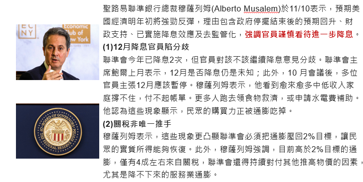 Fed官員穆薩列姆於11/10表示,預期美國經濟明年初將反彈,應謹慎看待進一步降息