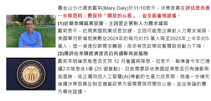 Fed官員戴莉於11/10表示,官員在評估是否進一步降息時,應保持開放心態