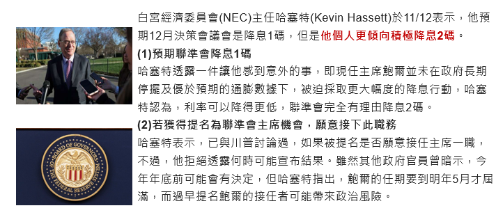 白宮經濟委員主任哈塞特於11/12表示,預期12月決策會議降息1碼
